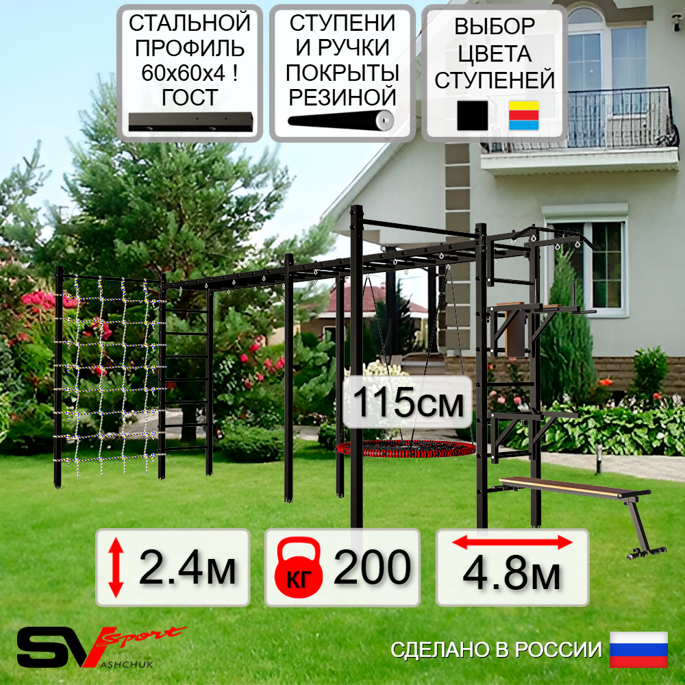 КОМПЛЕКТАЦИЯ: Каркас УШС Sv Sport Рукоход х 2, Турник Sv Sport стандарт к УШС, Брусья Sv Sport к УШС, Стойка под штангу Sv Sport к УШС, Скамья для пресса и жима Sv Sport к УШС, Качели - гнездо 115см, Сетка к спортивному комплексу, Комплект турник прямой 2шт.