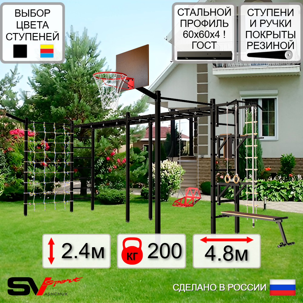 КОМПЛЕКТАЦИЯ: Каркас УШС Sv Sport Рукоход х 2, Турник Sv Sport стандарт к УШС, Брусья Sv Sport к УШС, Стойка под штангу Sv Sport к УШС, Скамья для пресса и жима Sv Sport к УШС, Качели пластиковые со спинкой на цепях, Щит баскетбольный Sv Sport c кронштейном к УШС Sv Sport, Кронштейн для подвеса боксерского мешка, Комплект: канат с крепежом, кольца гимнастические деревянные, лестница веревочная, Сетка к спортивному комплексу, Комплект турник прямой 2шт.