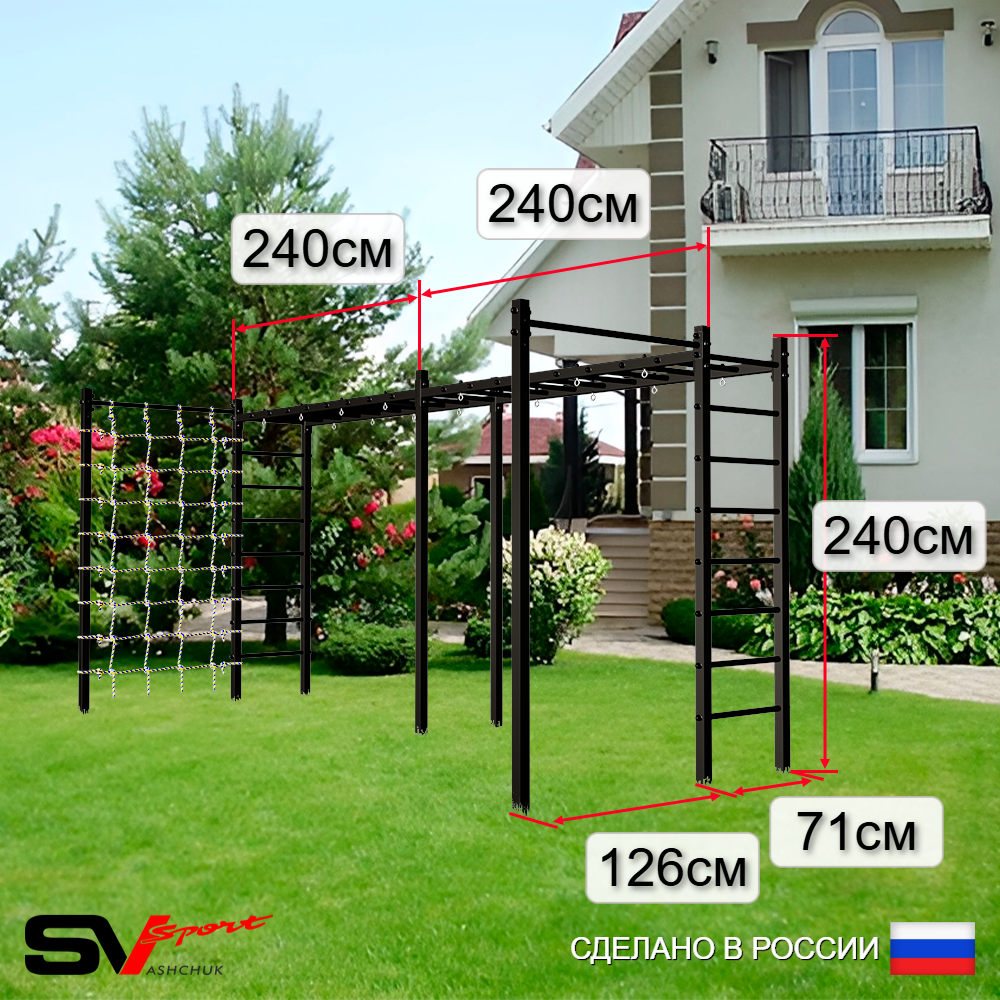КОМПЛЕКТАЦИЯ: Каркас УШС Sv Sport Рукоход х 2, Турник Sv Sport стандарт к УШС, Качели деревянные на цепях Sv Sport, Кронштейн для подвеса боксерского мешка, Комплект: канат с крепежом, кольца гимнастические деревянные, лестница веревочная, Сетка к спортивному комплексу, Комплект турник прямой 2шт.
