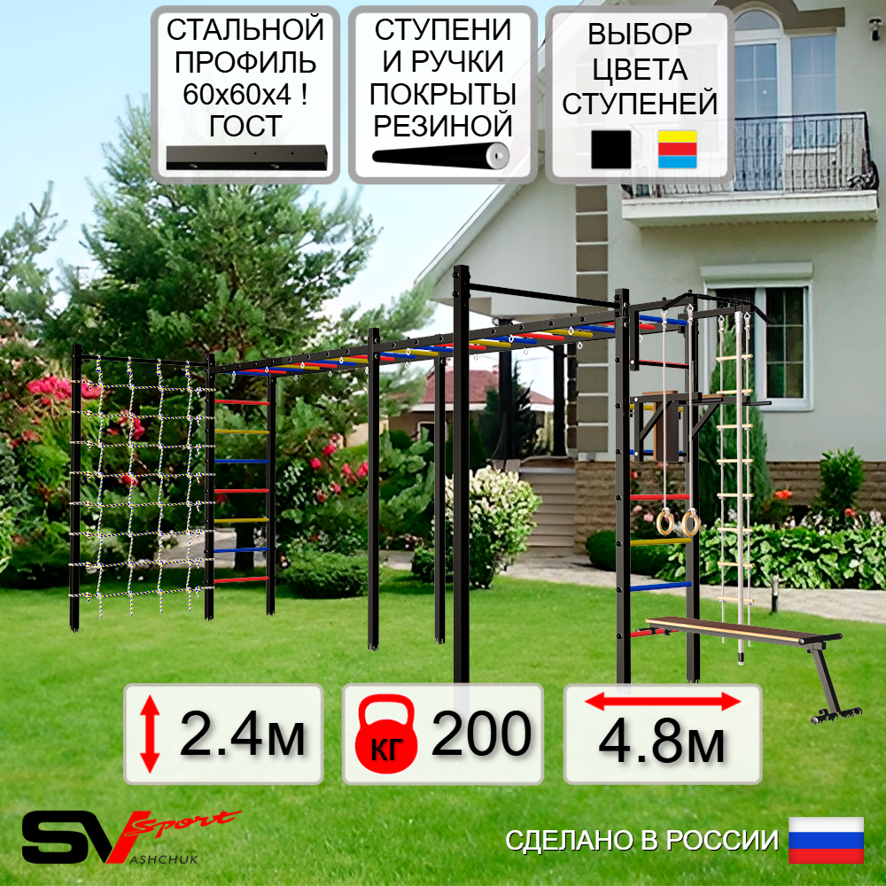 КОМПЛЕКТАЦИЯ: Каркас УШС Sv Sport Рукоход х 2, Турник Sv Sport стандарт к УШС, Брусья Sv Sport к УШС, Скамья для пресса и жима Sv Sport к УШС, Комплект: канат с крепежом, кольца гимнастические деревянные, лестница веревочная, Сетка к спортивному комплексу, Комплект турник прямой 2шт.