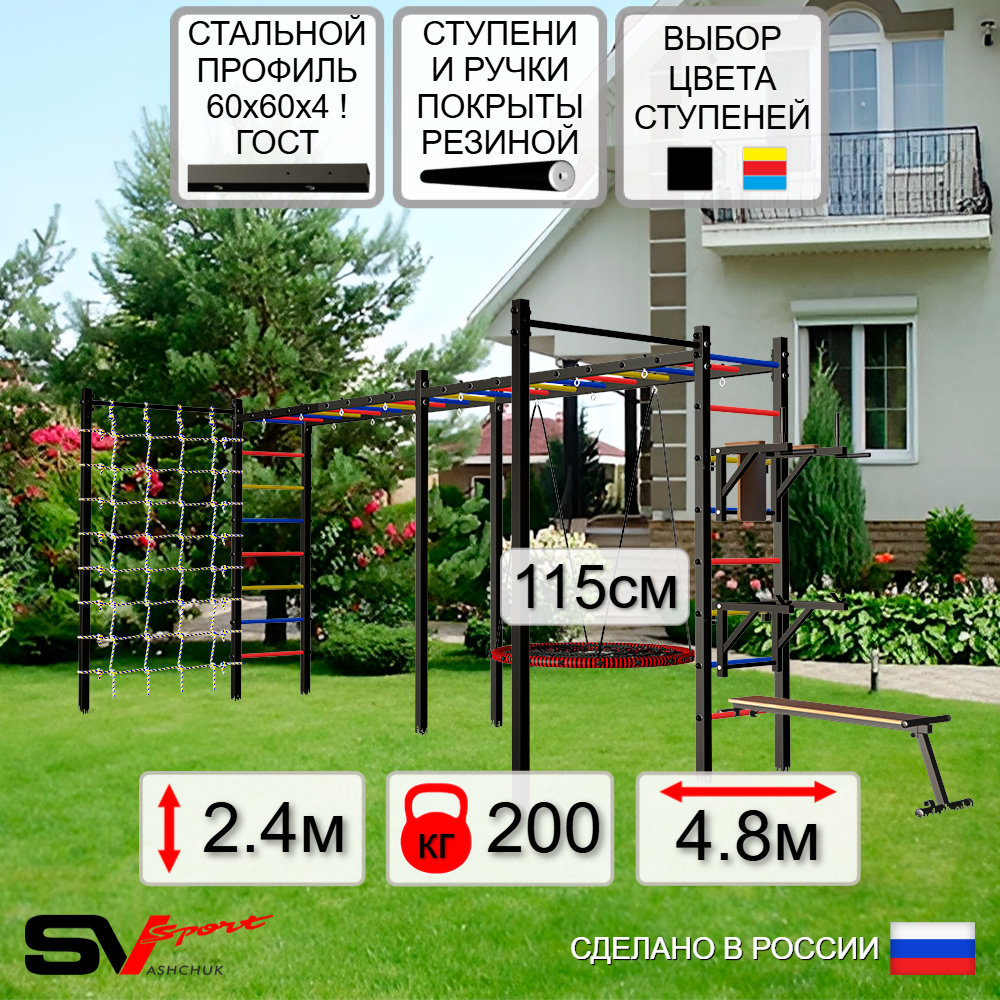 КОМПЛЕКТАЦИЯ: Каркас УШС Sv Sport Рукоход х 2, Брусья Sv Sport к УШС, Стойка под штангу Sv Sport к УШС, Скамья для пресса и жима Sv Sport к УШС, Качели - гнездо 115см, Сетка к спортивному комплексу, Комплект турник прямой 2шт.