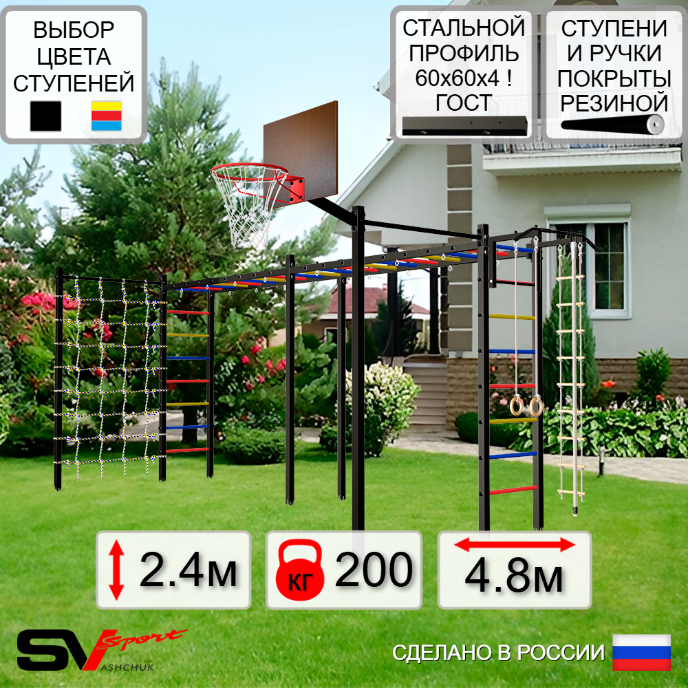 КОМПЛЕКТАЦИЯ: Каркас УШС Sv Sport Рукоход х 2, Турник Sv Sport стандарт к УШС, Щит баскетбольный Sv Sport c кронштейном к УШС Sv Sport, Комплект: канат с крепежом, кольца гимнастические деревянные, лестница веревочная, Сетка к спортивному комплексу, Комплект турник прямой 2шт.