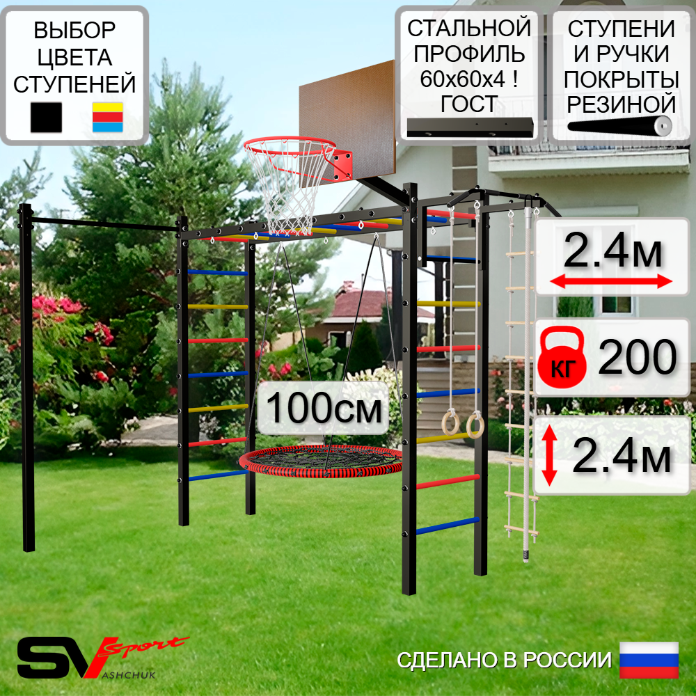 КОМПЛЕКТАЦИЯ: Каркас УШС Sv Sport Рукоход, Турник Sv Sport стандарт к УШС, Качели - гнездо 100см, Щит баскетбольный Sv Sport c кронштейном к УШС Sv Sport, Комплект: канат с крепежом, кольца гимнастические деревянные, лестница веревочная, Комплект турник прямой.