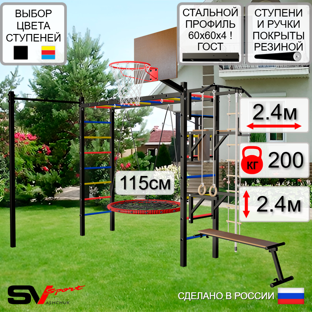 КОМПЛЕКТАЦИЯ: Каркас УШС Sv Sport Рукоход, Турник Sv Sport стандарт к УШС, Брусья Sv Sport к УШС, Стойка под штангу Sv Sport к УШС, Скамья для пресса и жима Sv Sport к УШС, Качели - гнездо 115см, Щит баскетбольный Sv Sport c кронштейном к УШС Sv Sport, Комплект: канат с крепежом, кольца гимнастические деревянные, лестница веревочная, Комплект турник прямой.
