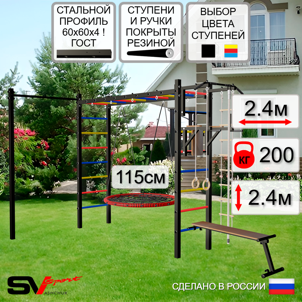 КОМПЛЕКТАЦИЯ: Каркас УШС Sv Sport Рукоход, Турник Sv Sport стандарт к УШС, Брусья Sv Sport к УШС, Скамья для пресса и жима Sv Sport к УШС, Качели - гнездо 115см, Комплект: канат с крепежом, кольца гимнастические деревянные, лестница веревочная, Комплект турник прямой.