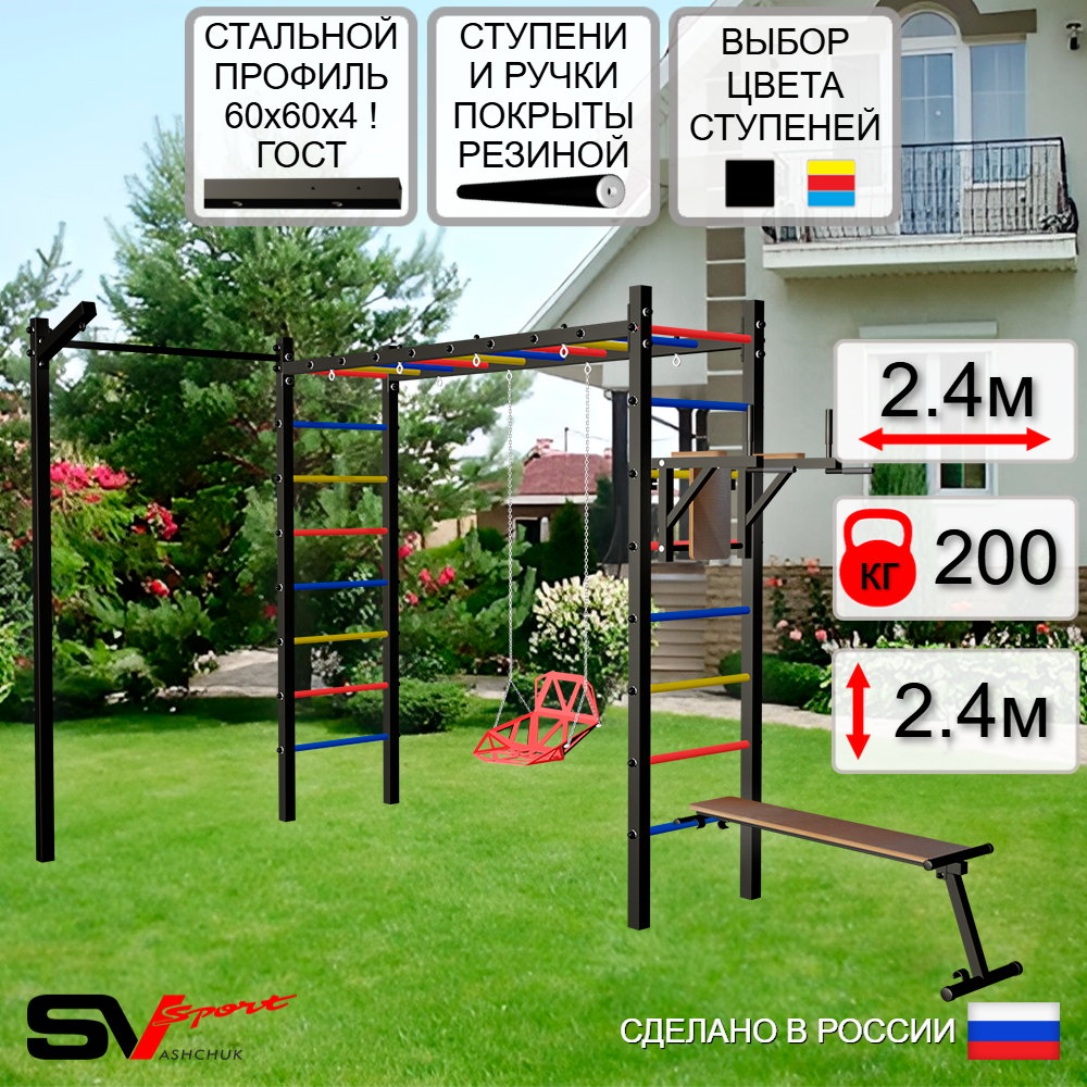 КОМПЛЕКТАЦИЯ: Каркас УШС Sv Sport Рукоход, Брусья Sv Sport к УШС, Скамья для пресса и жима Sv Sport к УШС, Качели пластиковые со спинкой на цепях, Кронштейн для подвеса боксерского мешка, Комплект турник прямой.