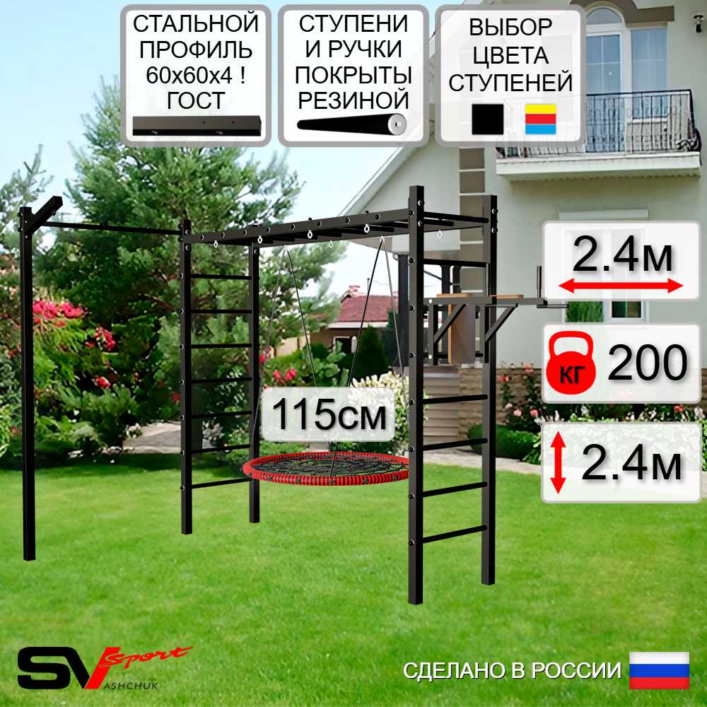 КОМПЛЕКТАЦИЯ: Каркас УШС Sv Sport Рукоход, Брусья Sv Sport к УШС, Качели - гнездо 115см, Кронштейн для подвеса боксерского мешка, Комплект турник прямой.