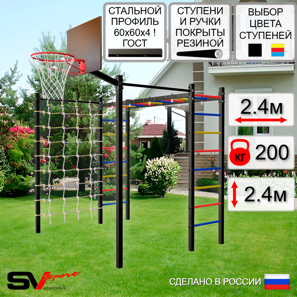 КОМПЛЕКТАЦИЯ: Каркас УШС Sv Sport Рукоход, Щит баскетбольный Sv Sport c кронштейном к УШС Sv Sport, Сетка к спортивному комплексу, Комплект турник прямой 2шт.