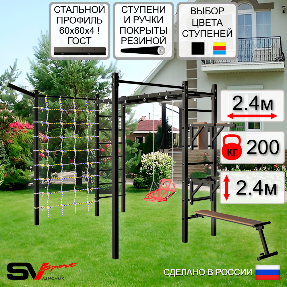КОМПЛЕКТАЦИЯ: Каркас УШС Sv Sport Рукоход, Брусья Sv Sport к УШС, Стойка под штангу Sv Sport к УШС, Скамья для пресса и жима Sv Sport к УШС, Качели пластиковые со спинкой на цепях, Кронштейн для подвеса боксерского мешка, Сетка к спортивному комплексу, Комплект турник прямой 2шт.