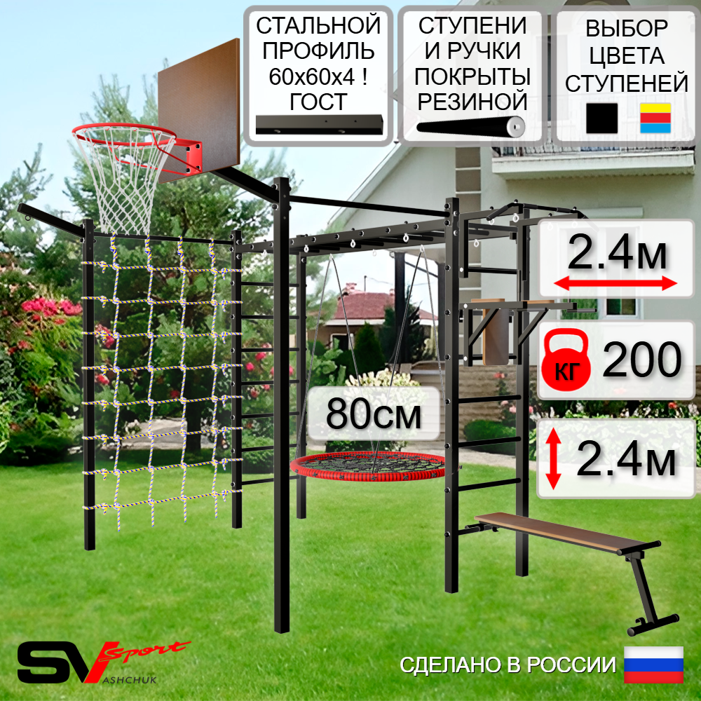 КОМПЛЕКТАЦИЯ: Каркас УШС Sv Sport Рукоход, Турник Sv Sport стандарт к УШС, Брусья Sv Sport к УШС, Скамья для пресса и жима Sv Sport к УШС, Качели - гнездо 80см, Щит баскетбольный Sv Sport c кронштейном к УШС Sv Sport, Кронштейн для подвеса боксерского мешка, Сетка к спортивному комплексу, Комплект турник прямой 2шт.
