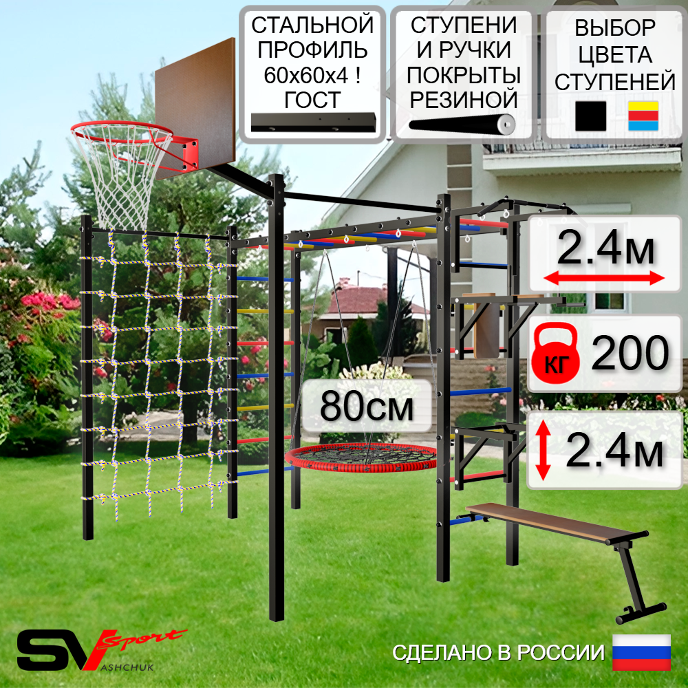 КОМПЛЕКТАЦИЯ: Каркас УШС Sv Sport Рукоход, Турник Sv Sport стандарт к УШС, Брусья Sv Sport к УШС, Стойка под штангу Sv Sport к УШС, Скамья для пресса и жима Sv Sport к УШС, Качели - гнездо 80см, Щит баскетбольный Sv Sport c кронштейном к УШС Sv Sport, Сетка к спортивному комплексу, Комплект турник прямой 2шт.