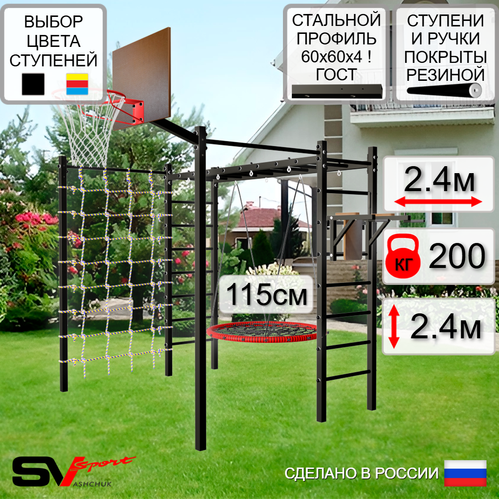 КОМПЛЕКТАЦИЯ: Каркас УШС Sv Sport Рукоход, Брусья Sv Sport к УШС, Качели - гнездо 115см, Щит баскетбольный Sv Sport c кронштейном к УШС Sv Sport, Сетка к спортивному комплексу, Комплект турник прямой 2шт.