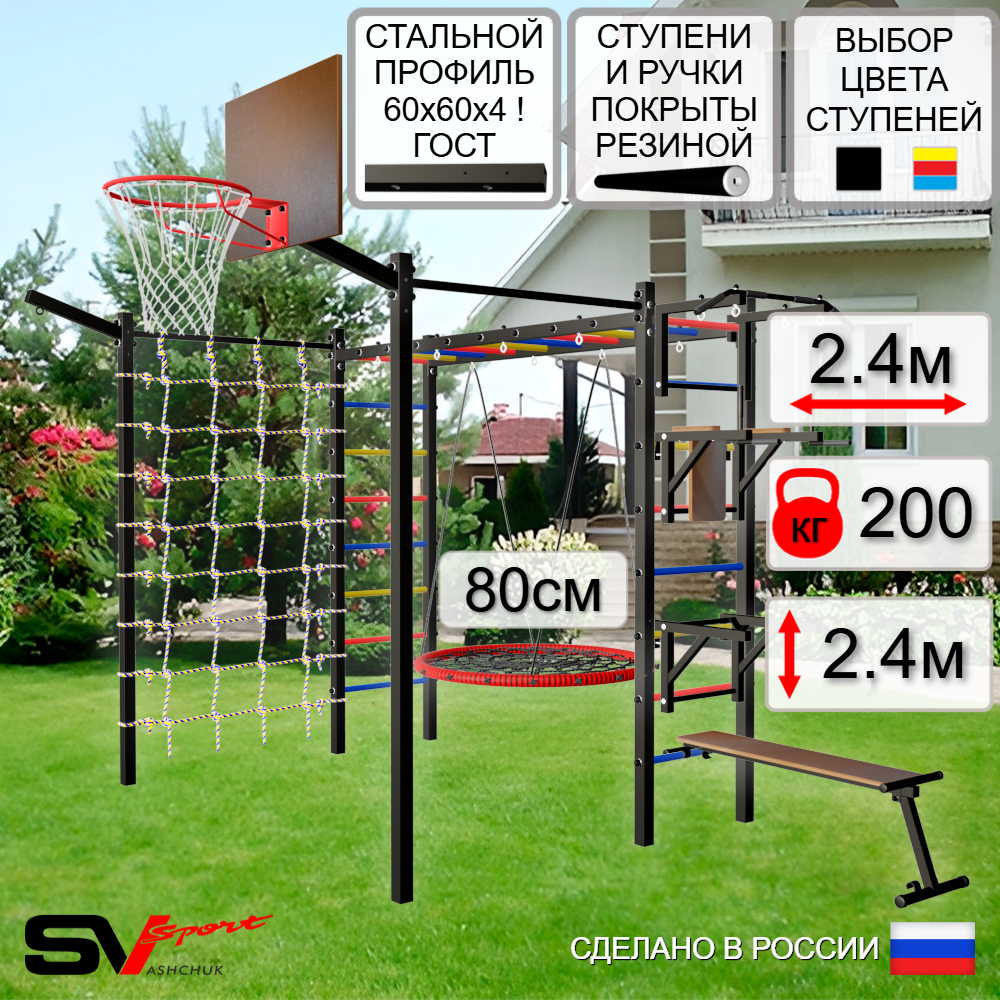 КОМПЛЕКТАЦИЯ: Каркас УШС Sv Sport Рукоход, Турник Sv Sport стандарт к УШС, Брусья Sv Sport к УШС, Стойка под штангу Sv Sport к УШС, Скамья для пресса и жима Sv Sport к УШС, Качели - гнездо 80см, Щит баскетбольный Sv Sport c кронштейном к УШС Sv Sport, Кронштейн для подвеса боксерского мешка, Сетка к спортивному комплексу, Комплект турник прямой 2шт.