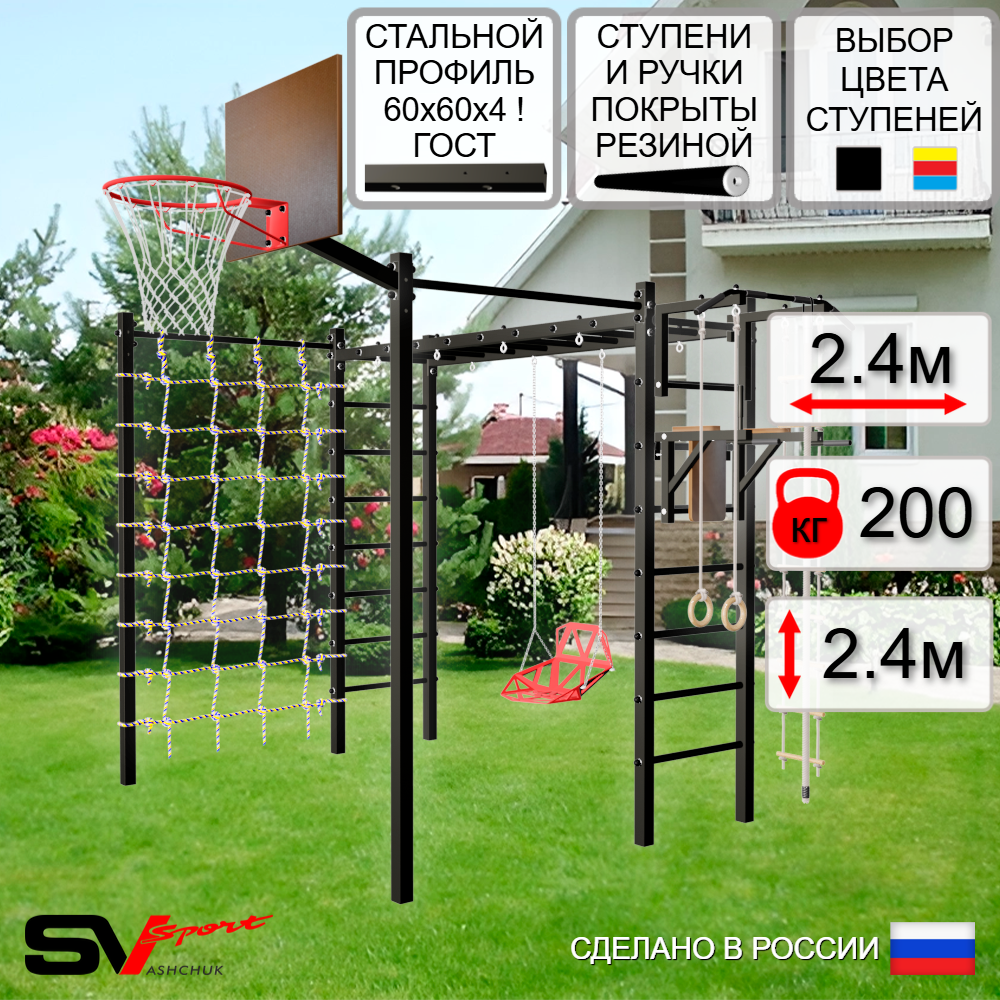 КОМПЛЕКТАЦИЯ: Каркас УШС Sv Sport Рукоход, Турник Sv Sport стандарт к УШС, Брусья Sv Sport к УШС, Качели пластиковые со спинкой на цепях, Щит баскетбольный Sv Sport c кронштейном к УШС Sv Sport, Комплект: канат с крепежом, кольца гимнастические деревянные, лестница веревочная, Сетка к спортивному комплексу, Комплект турник прямой 2шт.
