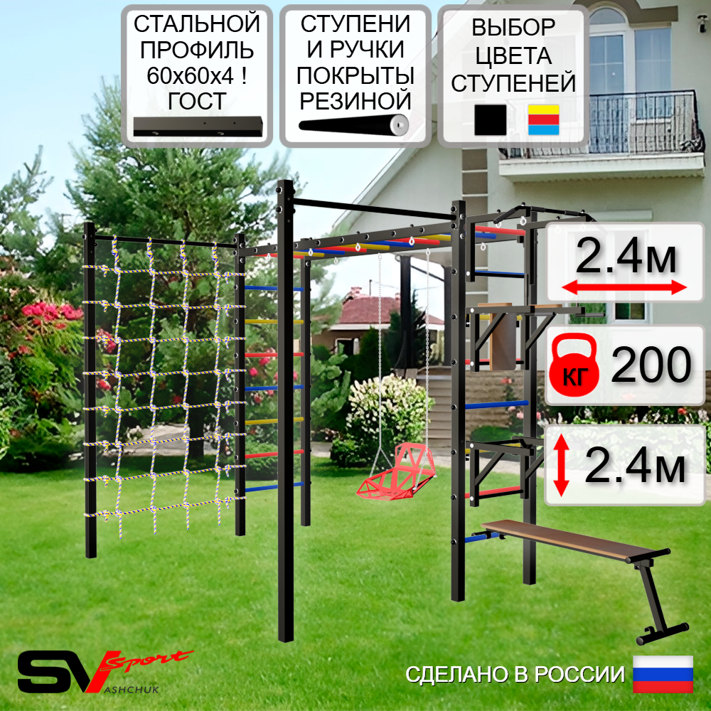 КОМПЛЕКТАЦИЯ: Каркас УШС Sv Sport Рукоход, Турник Sv Sport стандарт к УШС, Брусья Sv Sport к УШС, Стойка под штангу Sv Sport к УШС, Скамья для пресса и жима Sv Sport к УШС, Качели пластиковые со спинкой на цепях, Сетка к спортивному комплексу, Комплект турник прямой 2шт.