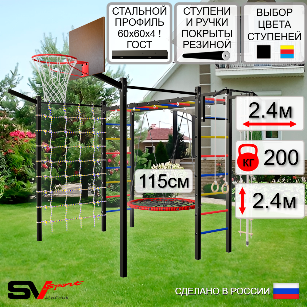 КОМПЛЕКТАЦИЯ: Каркас УШС Sv Sport Рукоход, Турник Sv Sport стандарт к УШС, Качели - гнездо 115см, Щит баскетбольный Sv Sport c кронштейном к УШС Sv Sport, Кронштейн для подвеса боксерского мешка, Комплект: канат с крепежом, кольца гимнастические деревянные, лестница веревочная, Сетка к спортивному комплексу, Комплект турник прямой 2шт.