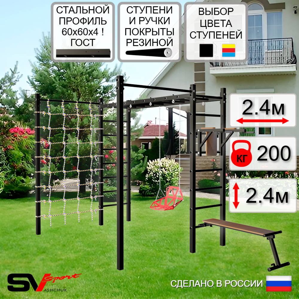 КОМПЛЕКТАЦИЯ: Каркас УШС Sv Sport Рукоход, Брусья Sv Sport к УШС, Скамья для пресса и жима Sv Sport к УШС, Качели пластиковые со спинкой на цепях, Сетка к спортивному комплексу, Комплект турник прямой 2шт.