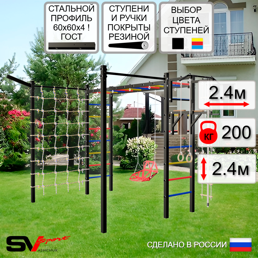 КОМПЛЕКТАЦИЯ: Каркас УШС Sv Sport Рукоход, Турник Sv Sport стандарт к УШС, Брусья Sv Sport к УШС, Качели пластиковые со спинкой на цепях, Кронштейн для подвеса боксерского мешка, Комплект: канат с крепежом, кольца гимнастические деревянные, лестница веревочная, Сетка к спортивному комплексу, Комплект турник прямой 2шт.