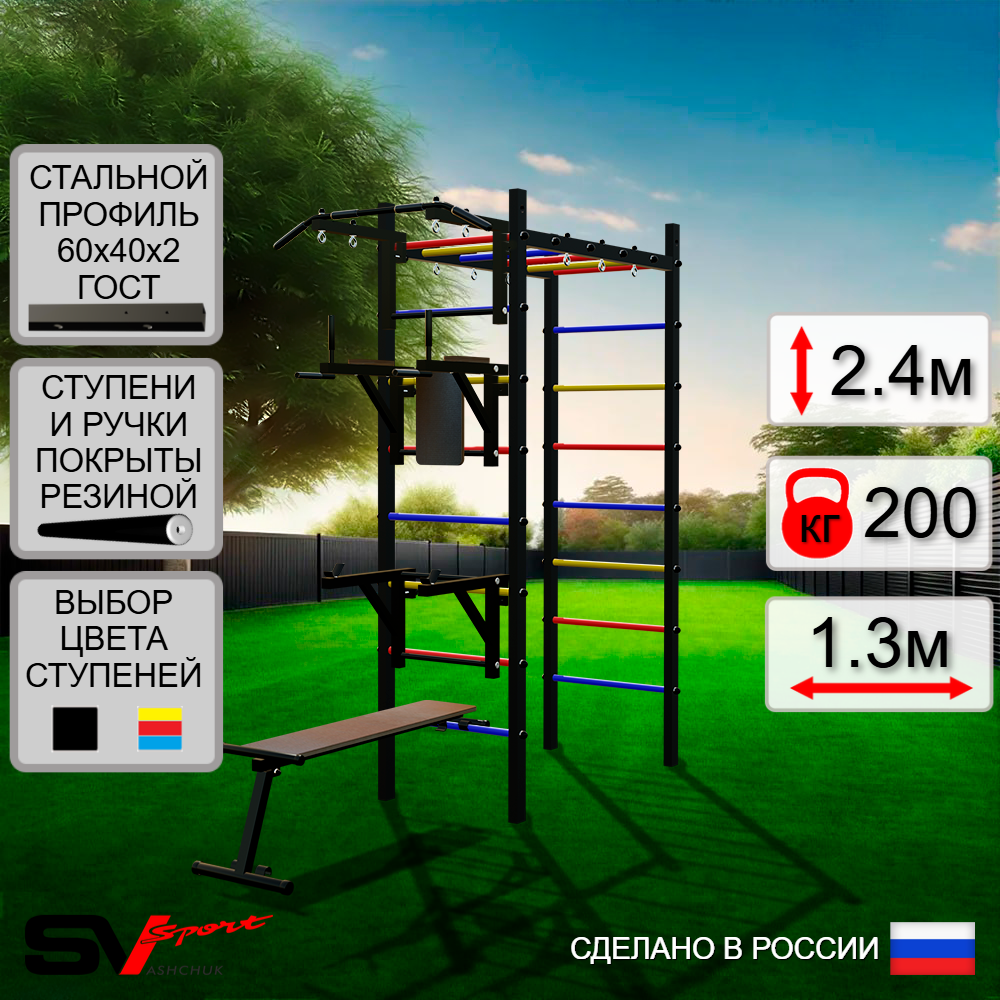 КОМПЛЕКТАЦИЯ: Каркас УСИК Sv Sport Рукоход, Турник Sv Sport стандарт к УШС, Брусья Sv Sport к УШС, Стойка под штангу Sv Sport к УШС, Скамья для пресса и жима Sv Sport к УШС.