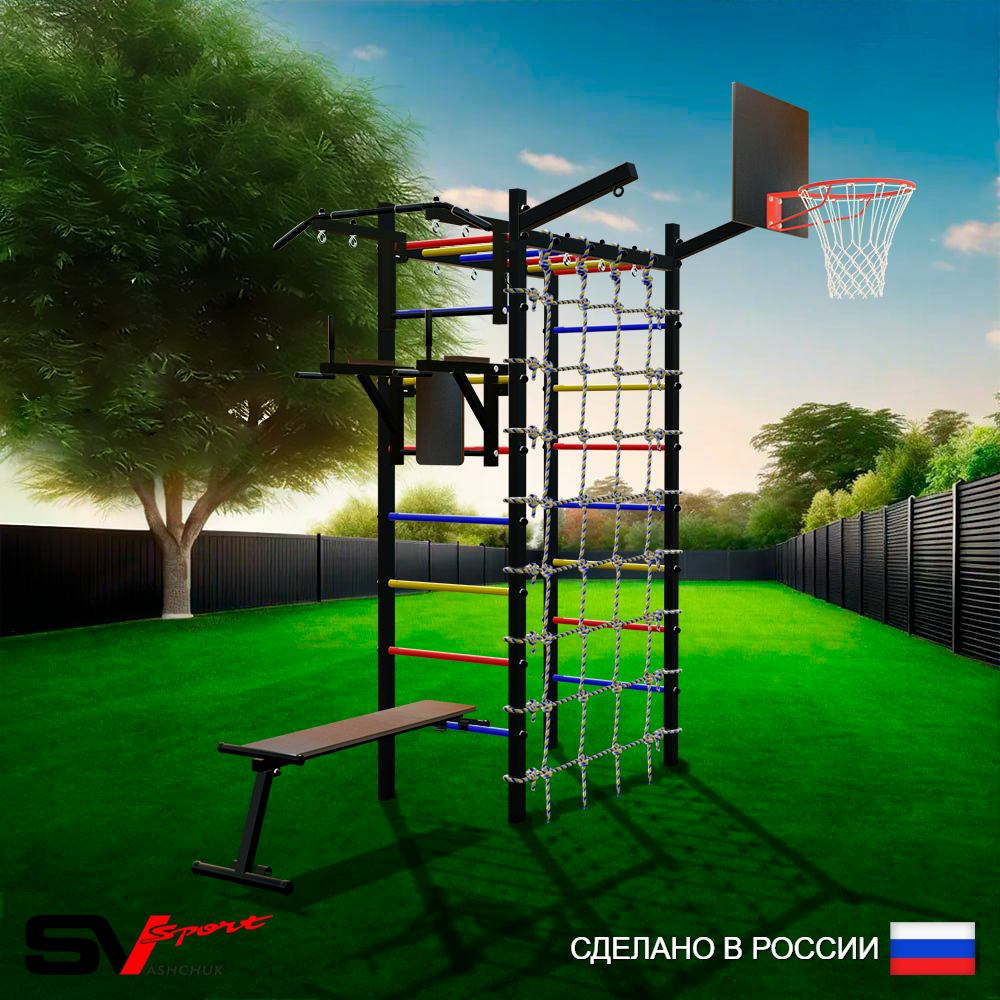 КОМПЛЕКТАЦИЯ: Каркас УСИК Sv Sport Рукоход, Турник Sv Sport стандарт к УШС, Брусья Sv Sport к УШС, Скамья для пресса и жима Sv Sport к УШС, Щит баскетбольный Sv Sport c кронштейном к УШС Sv Sport, Кронштейн для подвеса боксерского мешка Sv Sport, Сетка к спортивному комплексу.