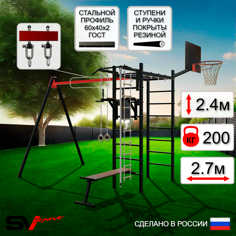КОМПЛЕКТАЦИЯ: Каркас УСИК Sv Sport, Турник Sv Sport стандарт к УШС, Брусья Sv Sport к УШС, Скамья для пресса и жима Sv Sport к УШС, Подвесы для качелей на втулках Sv Sport, Щит баскетбольный Sv Sport c кронштейном к УШС Sv Sport, Kанат, Kольца деревянные, Лестница веревочная.