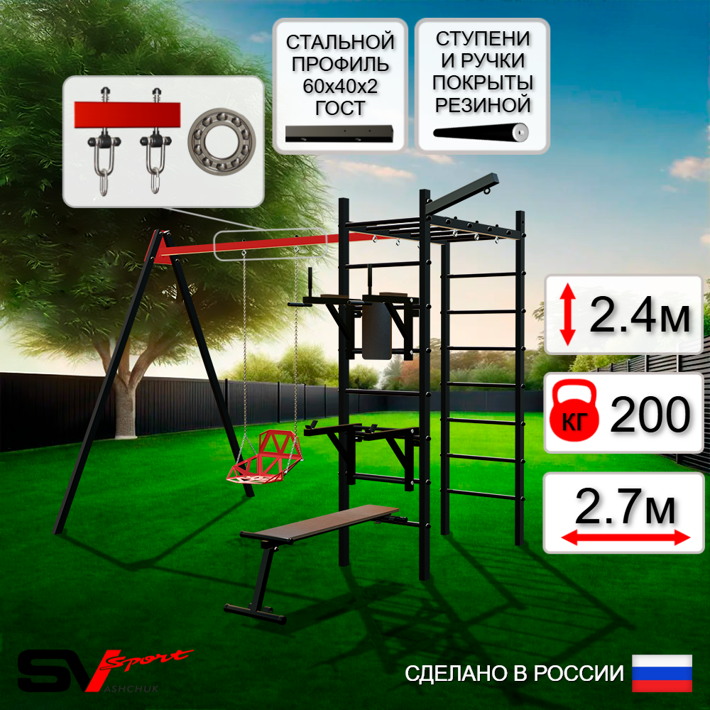 КОМПЛЕКТАЦИЯ: Каркас УСИК Sv Sport, Брусья Sv Sport к УШС, Стойка под штангу Sv Sport к УШС, Скамья для пресса и жима Sv Sport к УШС, Качели пластиковые со спинкой на цепях, Подвесы для качелей на подшипниках Sv Sport, Кронштейн для подвеса боксерского мешка Sv Sport.