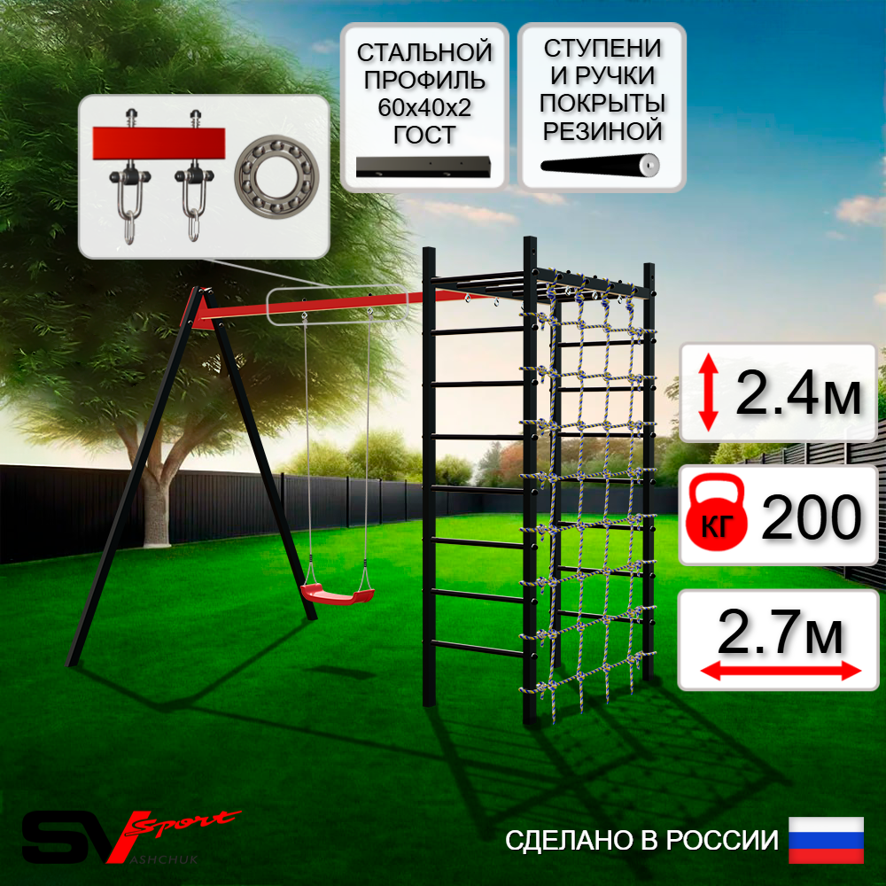 Уличный спортивно-игровой комплекс Sv Sport с качелями изготовлен из профильной трубы 60х40 мм, толщиной 3 мм (балка качелей), 2 мм (опоры и рукоход). Крепление опор изготовлено из пластины, толщиной 5 мм. Окрашен уличный спортивно-игровой комплекс качественной, импортной порошковой краской в 2 слоя, которая устойчива к истиранию и температурным перепадам. Все торцы, болты, гайки закрыты пластиковыми заглушками отличного качества. Использующиеся болты и гайки оцинкованы и соответствуют требованиям ГОСТ. Устанавливается спортивно-игровой комплекс путем бетонировки на глубину не менее 600 мм (опоры рукохода) и 400 мм (опоры качелей).