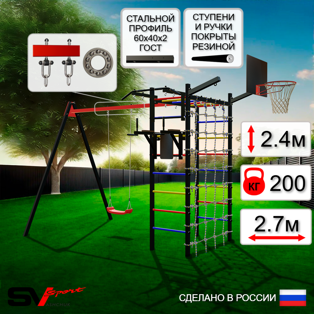 Уличный спортивно-игровой комплекс Sv Sport с качелями изготовлен из профильной трубы 60х40 мм, толщиной 3 мм (балка качелей), 2 мм (опоры и рукоход). Крепление опор изготовлено из пластины, толщиной 5 мм. Окрашен уличный спортивно-игровой комплекс качественной, импортной порошковой краской в 2 слоя, которая устойчива к истиранию и температурным перепадам. Все торцы, болты, гайки закрыты пластиковыми заглушками отличного качества. Использующиеся болты и гайки оцинкованы и соответствуют требованиям ГОСТ. Устанавливается спортивно-игровой комплекс путем бетонировки на глубину не менее 600 мм (опоры рукохода) и 400 мм (опоры качелей).
