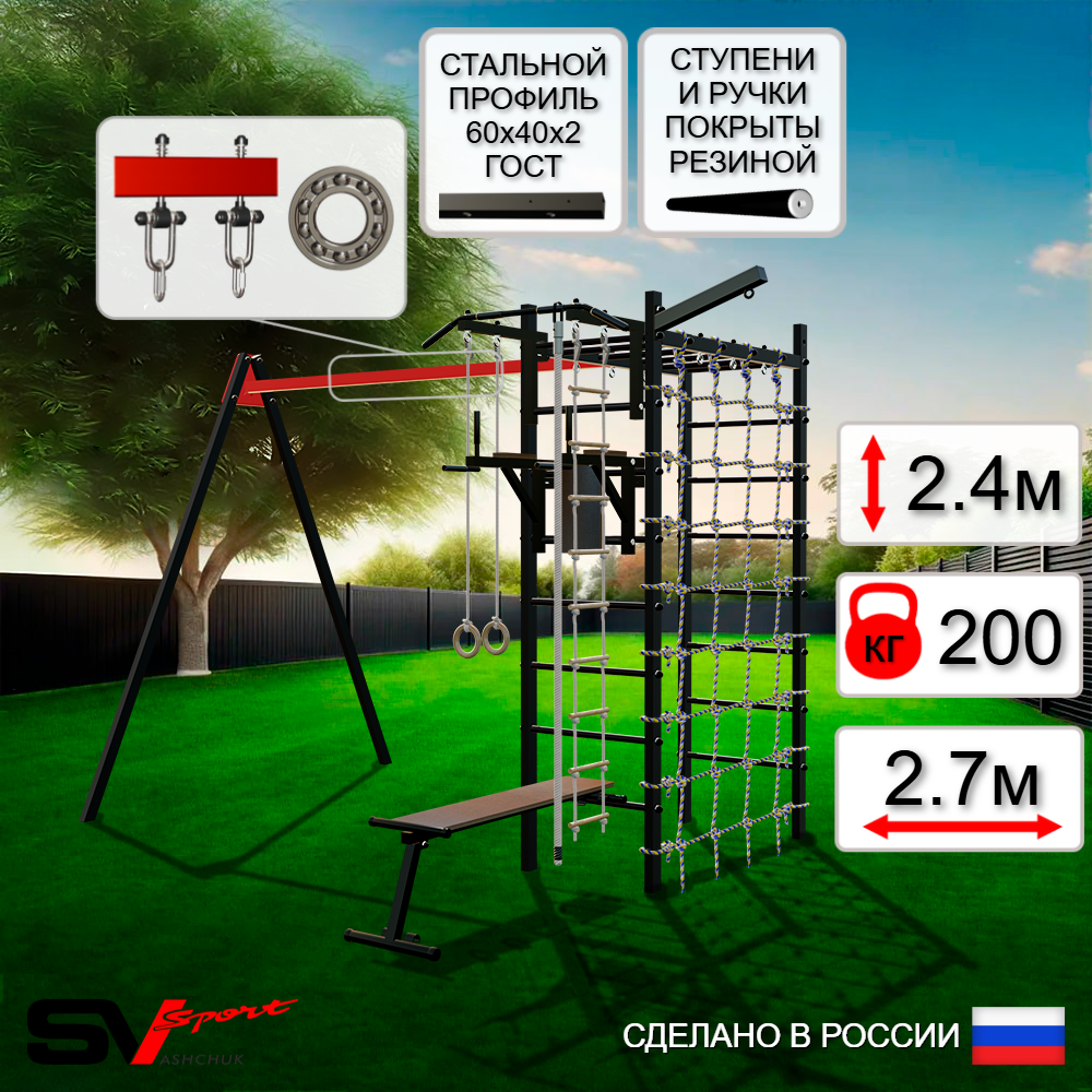 КОМПЛЕКТАЦИЯ: Каркас УСИК Sv Sport, Турник Sv Sport стандарт к УШС, Брусья Sv Sport к УШС, Скамья для пресса и жима Sv Sport к УШС, Подвесы для качелей на подшипниках Sv Sport, Кронштейн для подвеса боксерского мешка Sv Sport, Kанат, Kольца деревянные, Лестница веревочная, Сетка к спортивному комплексу.