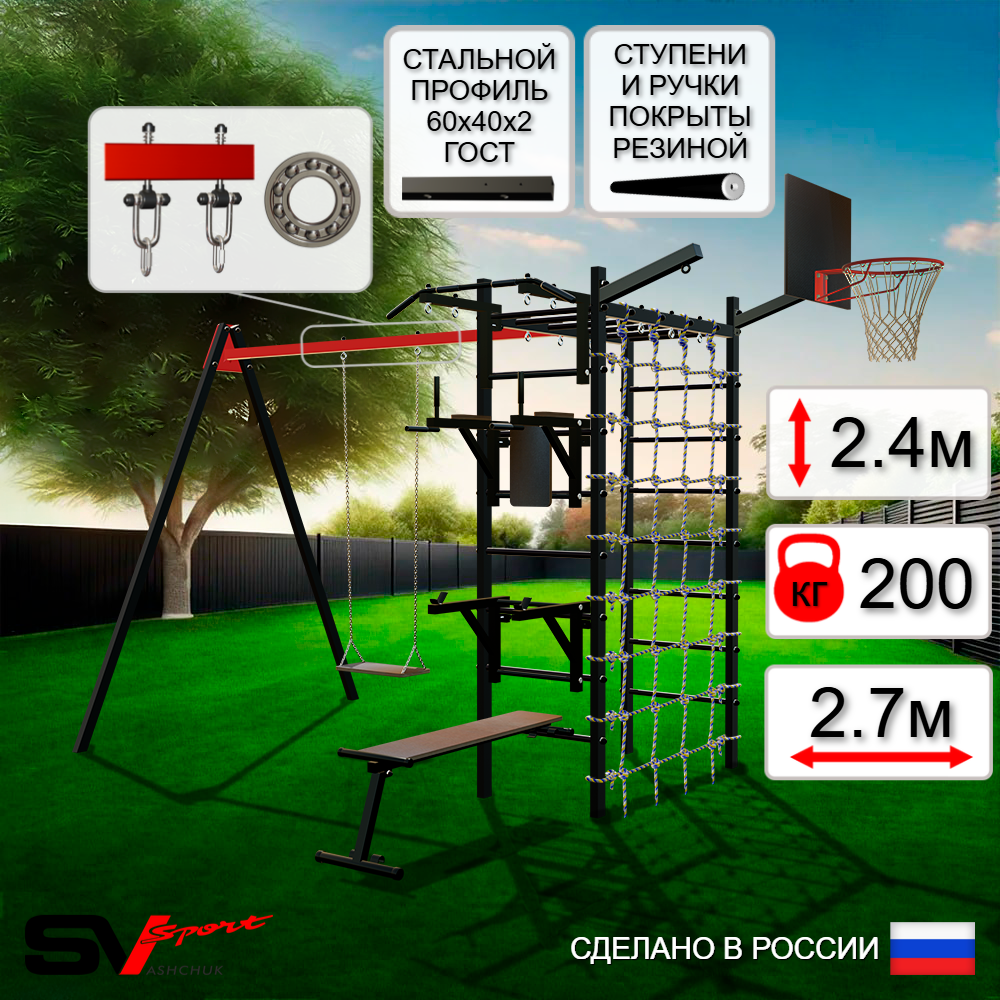 КОМПЛЕКТАЦИЯ: Каркас УСИК Sv Sport, Турник Sv Sport стандарт к УШС, Брусья Sv Sport к УШС, Стойка под штангу Sv Sport к УШС, Скамья для пресса и жима Sv Sport к УШС, Качели деревянные на цепях Sv Sport, Подвесы для качелей на подшипниках Sv Sport, Щит баскетбольный Sv Sport c кронштейном к УШС Sv Sport, Кронштейн для подвеса боксерского мешка Sv Sport, Сетка к спортивному комплексу.