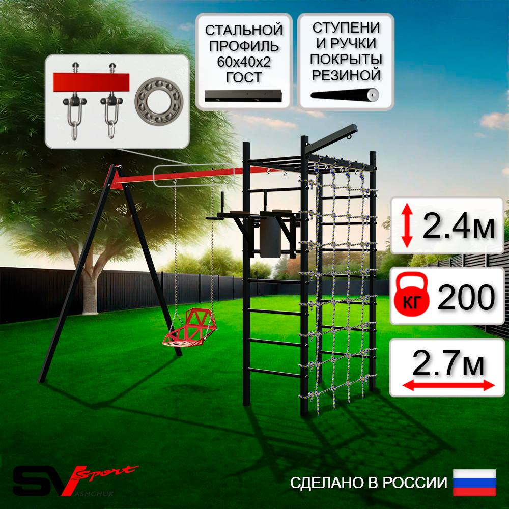 КОМПЛЕКТАЦИЯ: Каркас УСИК Sv Sport, Брусья Sv Sport к УШС, Качели пластиковые со спинкой на цепях, Подвесы для качелей на подшипниках Sv Sport, Кронштейн для подвеса боксерского мешка Sv Sport, Сетка к спортивному комплексу.