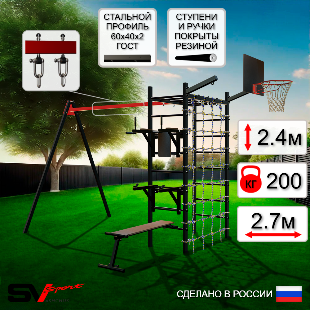 КОМПЛЕКТАЦИЯ: Каркас УСИК Sv Sport, Брусья Sv Sport к УШС, Стойка под штангу Sv Sport к УШС, Скамья для пресса и жима Sv Sport к УШС, Подвесы для качелей на втулках Sv Sport, Щит баскетбольный Sv Sport c кронштейном к УШС Sv Sport, Кронштейн для подвеса боксерского мешка Sv Sport, Сетка к спортивному комплексу.