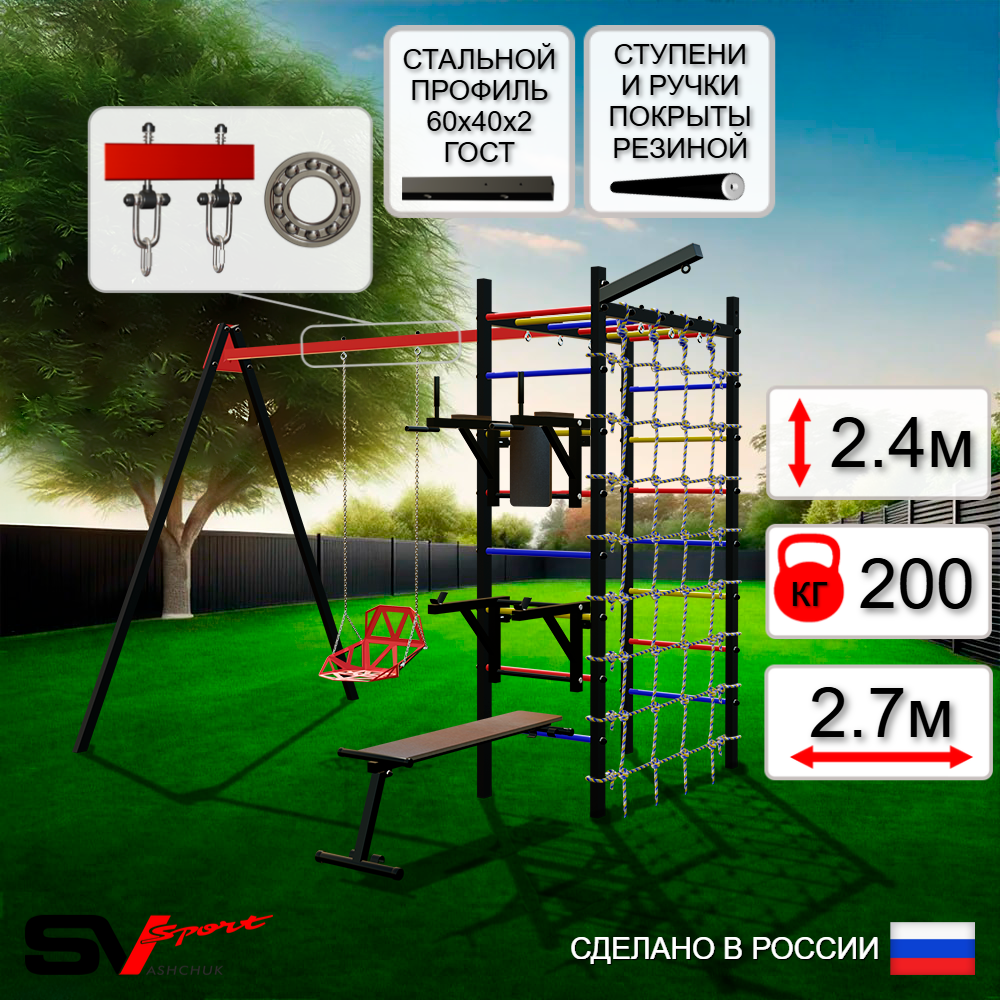 КОМПЛЕКТАЦИЯ: Каркас УСИК Sv Sport, Брусья Sv Sport к УШС, Стойка под штангу Sv Sport к УШС, Скамья для пресса и жима Sv Sport к УШС, Качели пластиковые со спинкой на цепях, Подвесы для качелей на подшипниках Sv Sport, Кронштейн для подвеса боксерского мешка Sv Sport, Сетка к спортивному комплексу.